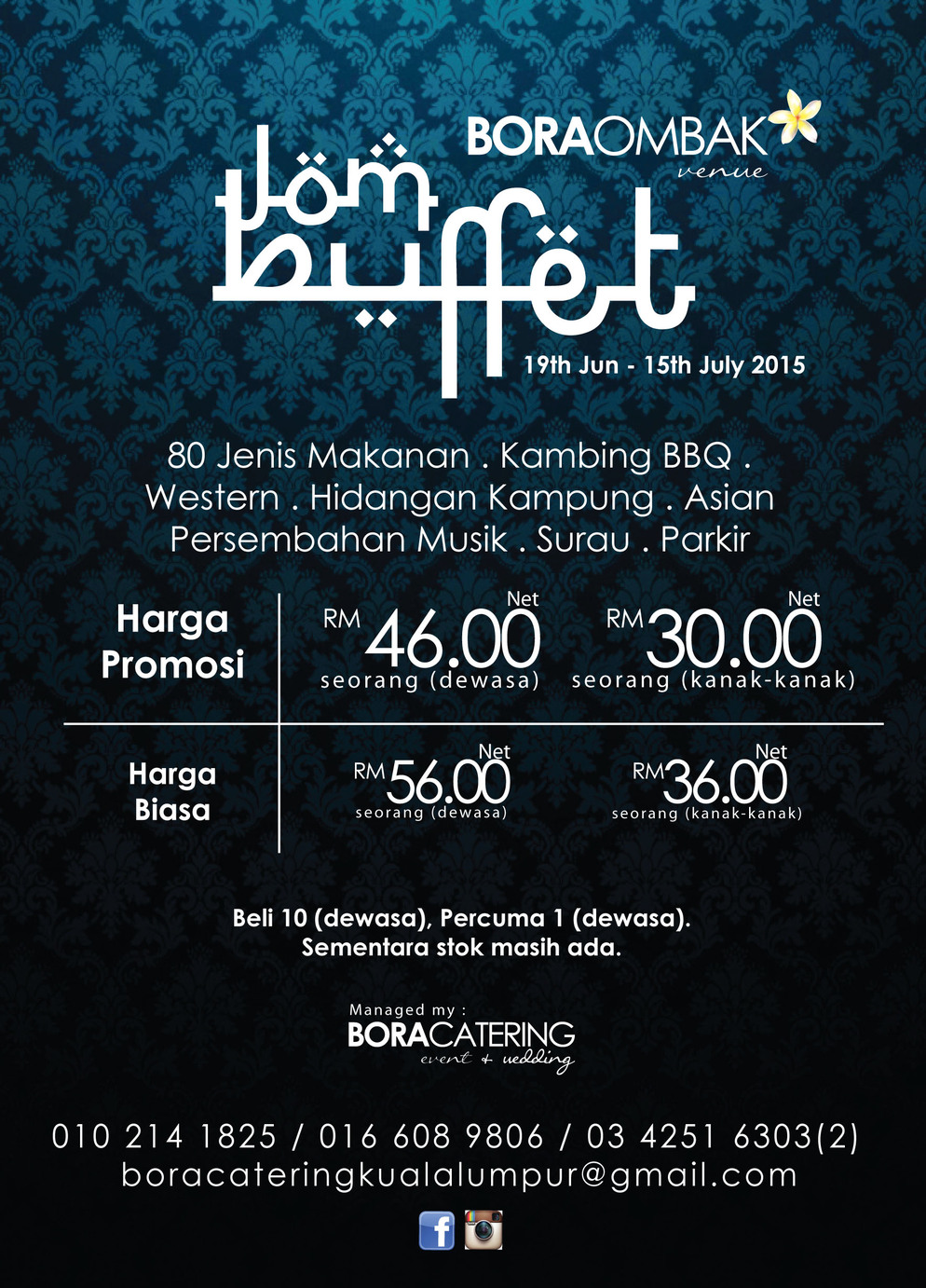 Harga early bird akan ditawarkan mulai 1 Mac dengan terhad. Enjoy 80 types of dishes for a special buffet at Bora Ombak this holy month. Nak maklumat lanjut segera hubungi nombor tertera.